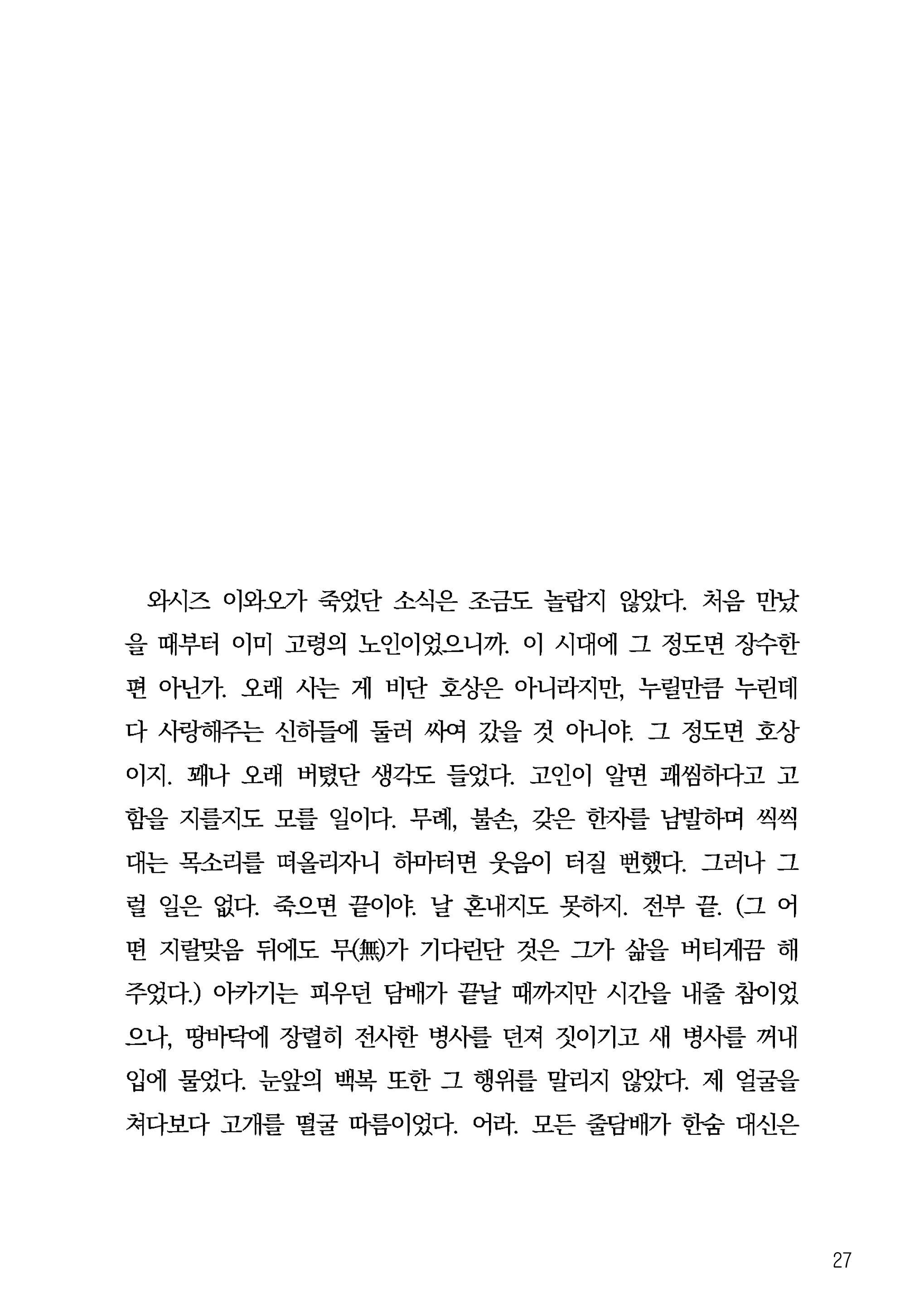 The news of Iwao Washizu's death came as no surprise. He was already an elderly man when I first met him. In this day and age, he lived a long life. Living a long life is not necessarily a blessing, but he enjoyed his life to the fullest and was surrounded by loyal vassals. In that sense, it was a blessing. I also felt that he had lived quite a long time. If the deceased knew, he might yell that it was outrageous. Thinking of his rude, disrespectful voice, spewing out all kinds of harsh words, I almost burst out laughing. But that won't happen. When you die, it's over. He can't scold me anymore. It's all over. (The fact that nothingness awaited me after all my nonsense was what kept me going in life.) Akagi was going to give him time until he finished his cigarette, but he threw the soldier who had died heroically on the ground and took out a new soldier and put it in his mouth. The white robe in front of him did not stop him. He just looked at his face and shook his head. Huh. Not all cigarettes are sighs. It's not like you're in mourning or anything. I just want to smoke one more. Akagi had grown up enough not to say such things out loud. He had grown up. He had grown old. That's right. It was appropriate to say he had grown old. After the first digit became 2, everyone seemed to describe it as growing old. The same was true for the white-robed man in front of Akagi. Was it Suzuki? It took time to recognize him because of his wrinkles, but I think that was his name. Akagi was now on his fourth cigarette, and no one spoke. Suzuki remained silent, and Akagi let him misunderstand. Akagi thought that if someone spoke, it wouldn't be his turn. It was an overly peaceful morning. As the clouds drifted by, the patterns created by the light and shadow fell on the two men's faces. When the sunlight came back in, they had no choice but to squint their eyes. It was painful. Akagi was just… tired. I don't care about lords, vassals, or loyalty. I suppose I should say it's amazing that he found me somehow. But I wonder why he's telling me about the past now. I wanted to leave the unwelcome guest alone and go back to my inn room to take a nap. It was because yesterday's mahjong game had been so exhausting. The days when I could stay up all night with clear eyes and excitement enveloping my whole body seemed like a past life. It's exhausting. Time is long and exhausting. Finally, Suzuki spoke again.