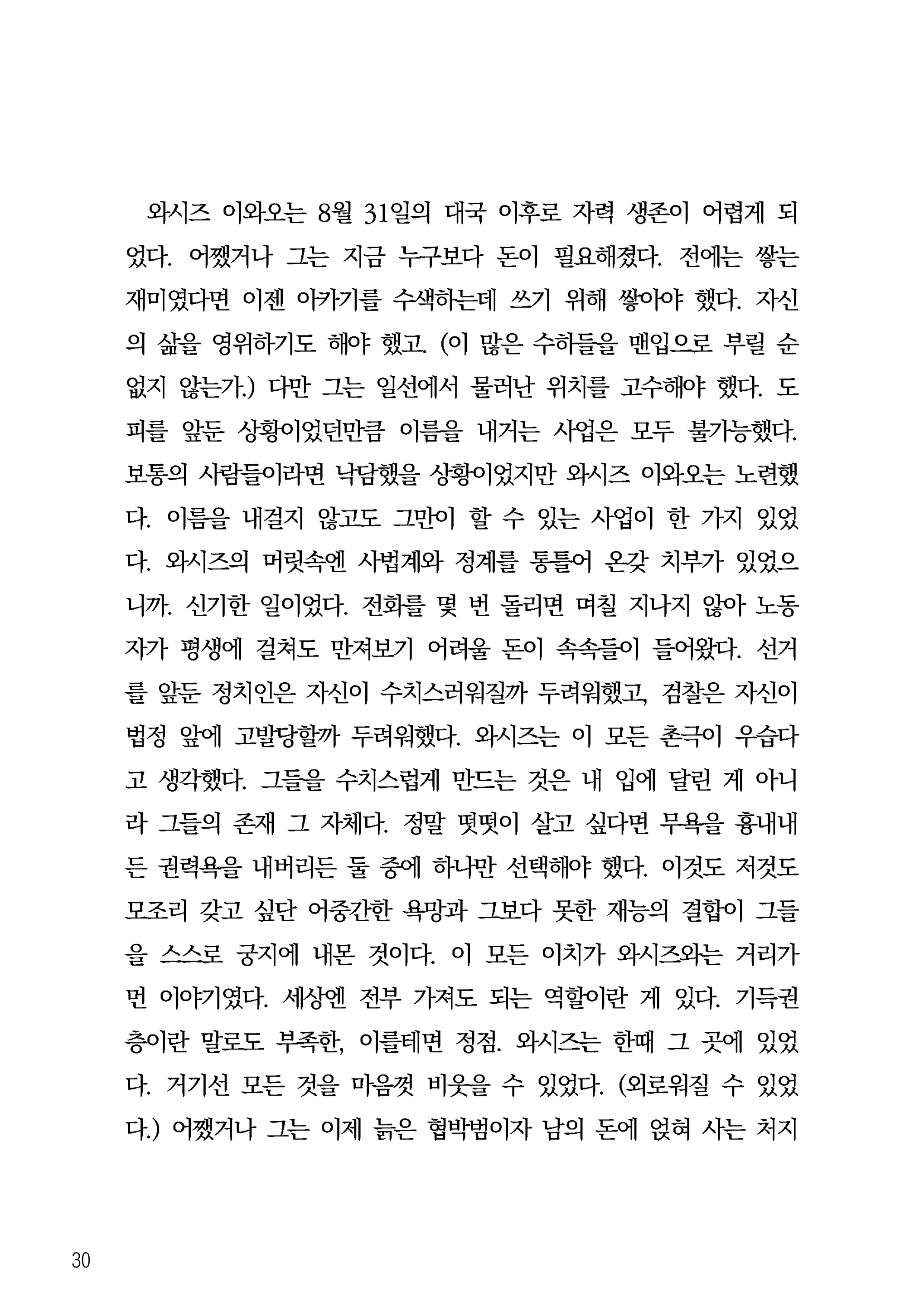 After the big game on August 31, Iwao Washizu found it difficult to survive on his own. In any case, he now needed money more than anyone else. Previously, he had enjoyed accumulating money, but now he had to accumulate it to search for Akagi. He also had to make a living for himself. (He couldn't just keep all these underlings on his payroll, could he?) However, he had to maintain his position behind the front lines. Given the situation, where he was about to flee, it was impossible to engage in any business that would expose his name. While ordinary people might have been discouraged by the situation, Washizu was experienced. There was one business he could do without exposing his name. After all, Washizu had all sorts of dirty secrets in his head, spanning the judicial and political worlds. It was a remarkable thing. After making a few phone calls, money that a worker would never be able to touch in a lifetime began to pour in within a few days. Politicians facing elections feared being disgraced, and prosecutors feared being brought to trial. Washizu found all this farcical. What disgraced them was not what came out of Washizu’s mouth, but their very existence. If one truly wanted to live with integrity, one had to choose between feigning indifference or abandoning the desire for power. The combination of mediocre talent and the half-hearted desire to have both led them to trap themselves. All of this was far removed from Washizu's world. There are certain roles in this world that allow you to have it all. It's more than just being part of the privileged class; it's like being at the top of the pyramid. Washizu was once there. From that position, he could laugh at everything he wanted. (He could have become lonely.) In any case, he is now an old extortionist living off other people's money. He couldn't avoid the gossip that came with his outstretched hand. The renowned Iwao Washizu has gone mad. He seems to have been mad for a long time, but now he is searching for someone with fire in his eyes. We don't know if it's his illegitimate child or a young woman... Washizu thought the gold rush was something that happened across the sea, but it seems that it happens anywhere when interests and greed are intertwined. If they just wait patiently, the old extortionist will surely die and take his many secrets with him. Impatient and hot-tempered individuals have taken it upon themselves to exploit Washizu's weakness. If they can find that person first, the tables will turn. They won't have to be fleeced by the old man. It didn't take long for this determination to reach Washizu's ears.